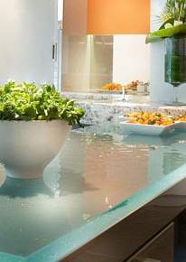 Большие возможности для декоративных решений. Из закаленного стекла или триплекса изготавливают мебель любых размеров, фактур, цветов и конфигураций. На нее можно нанести алмазную гравировку, пескоструйный рисунок, УФ-печать, художественную роспись, матирование.